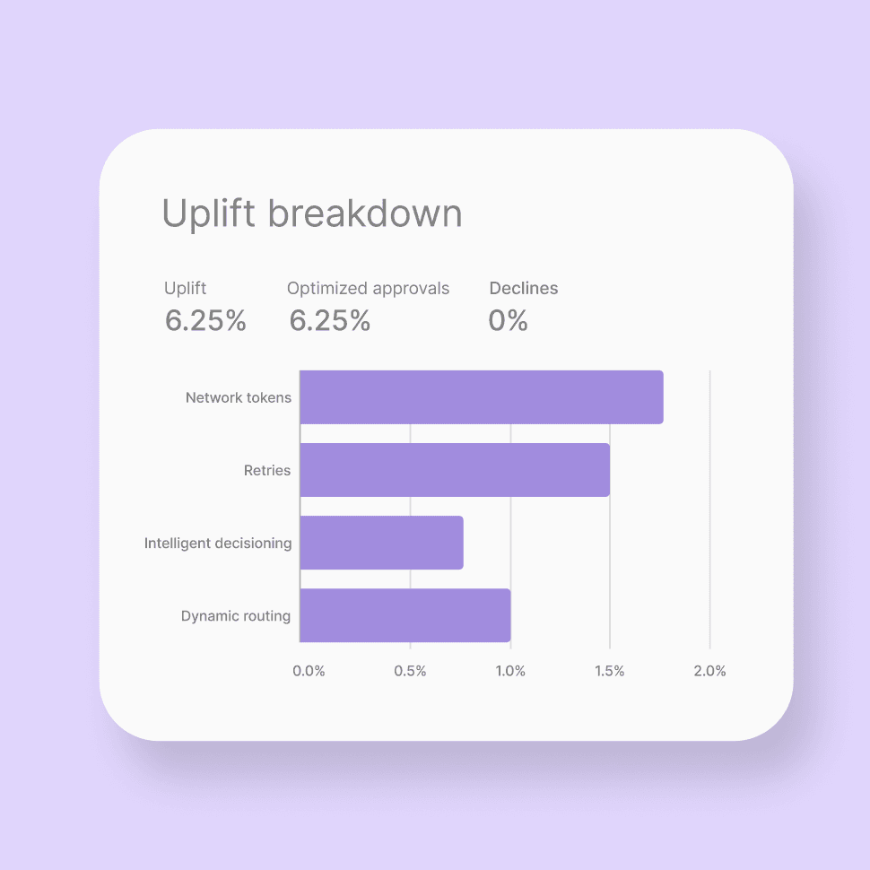 New optimization reporting, now embedded in your enterprise portal, gives you clear visibility into what’s driving approvals and where additional revenue can be recovered across acquirers and markets. Easily track revenue uplift and explore visual breakdowns of key optimization levers including network tokens, immediate retries and A/B testing.